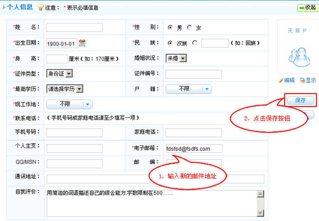 在打开的页面中,点击《个人信息》右边的《修改》按钮,如下图所示,输入新的E-mail地址,点击《保存信息》按钮即可。